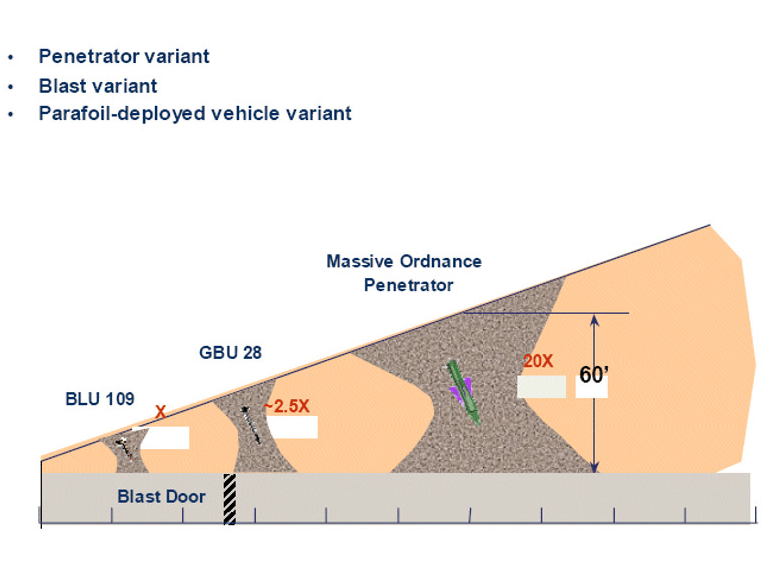 Air Force disclosures of MOPs historically have come at moments of heightened tension – designed in part to send a message of U.S. military strength to its adversaries. Indeed, the current flurry of MOP pictures comes amid a spike in geopolitical friction, including between the United States and North Korea over that country’s ballistic missile and nuclear weapons programs. As we have noted in the past, MOPs could prove instrumental in penetrating the various very deeply buried missile tunnels and other underground military facilities in North Korea, China, Iran, and Russia. Such underground networks are well beyond the reach of smaller bunker busters, such as 2,000-pound class BLU-109/Bs or BLU-137/Bs or 5,000-pound class GBU-28/Bs or GBU-72/Bs.
