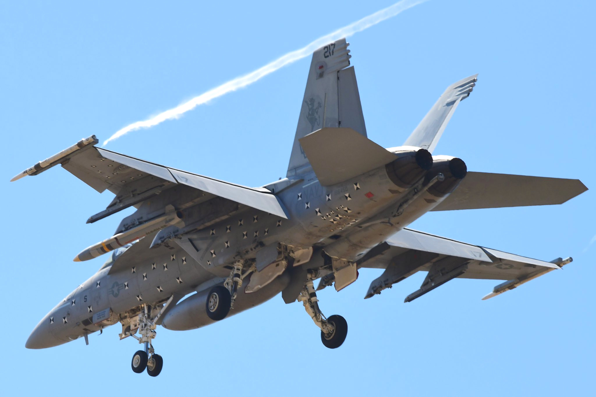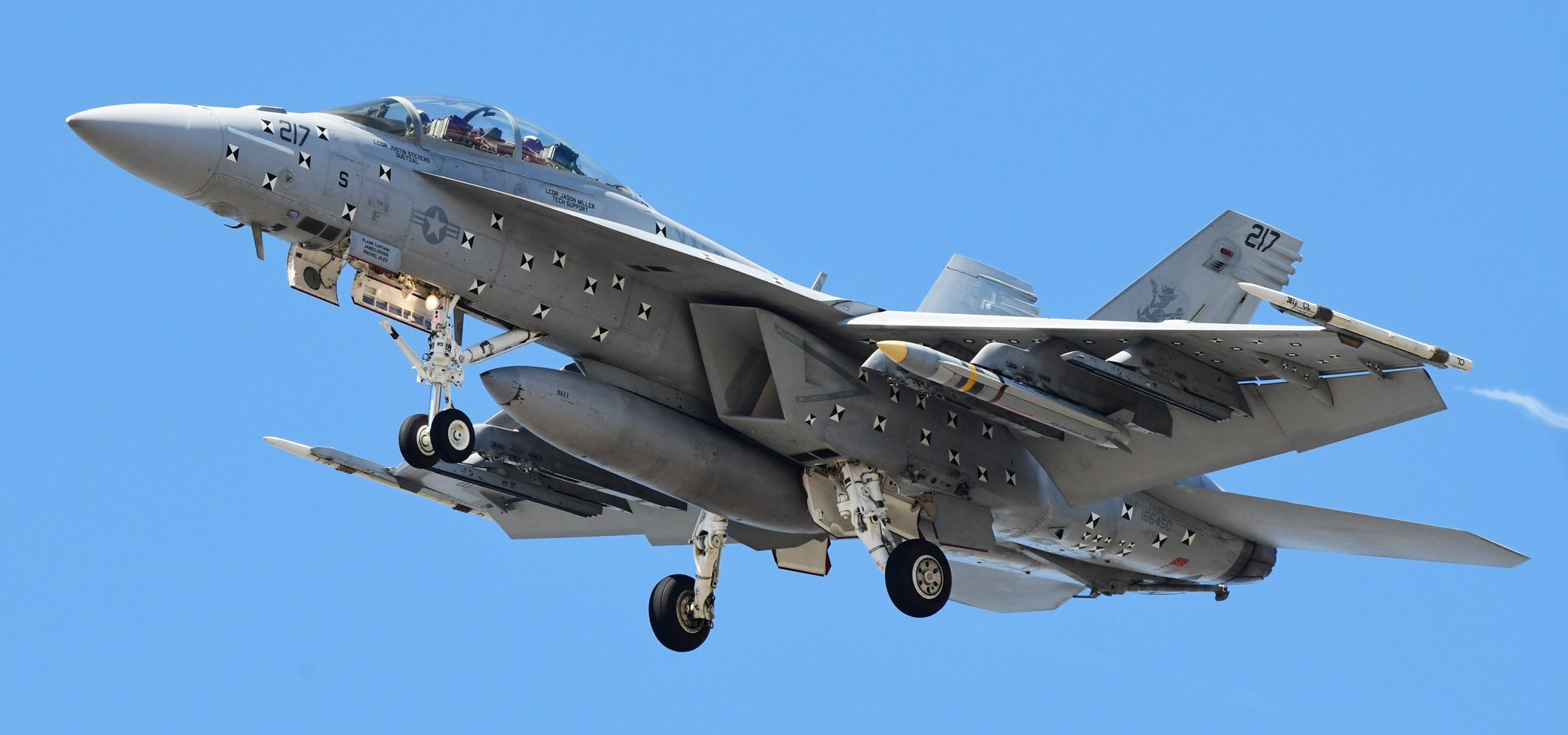The yellow band around a section of body of the AARGM-ER loaded onto the VX-31 F/A-18F indicates that it has a live warhead installed. This particular missile has a red-and-green colored commercial-style logo along the rear of its body, something that would not necessarily be seen on production weapons.