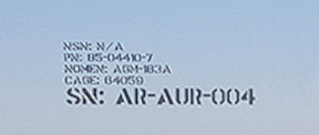 Interestingly, the pictures from the hypersonic weapon familiarization training event at Edwards yesterday also include a very good look at what appears to be a live AGM-183A missile. The weapon, seen loaded on B-52, has a yellow band around its body, which typically denotes a live round. It also has a protective cover over its rear end and is marked “AR-AUR-004,” with AUR very likely standing for “All Up Round,” a term that refers to a complete missile.