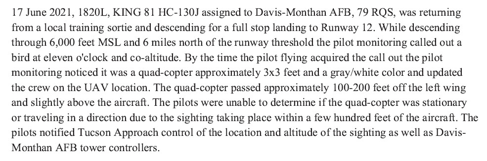 The HATRs Cecotti obtained include the six F-35-related incidents described earlier in this story, as well as three more that all appear to have involved C-130 variants. Those latter encounters all occurred in 2021, at altitudes under 6,000 feet, and involved what were expressly identified as drones. Two of them were categorized as dangerous near-collisions, again underscoring potential air safety concerns stemming just from increased drone overall and highlighting how malign actors might be able to exploit that reality.