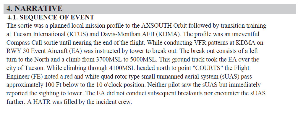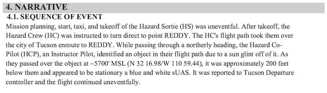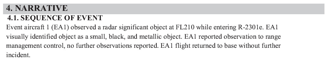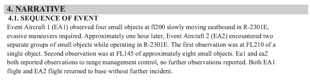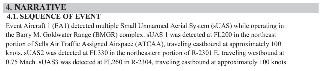 “sUAS 1 was detected at FL200 [20,000 feet] in the northeastern portion of Sells… ,traveling eastbound at approximately 100 knots,” according to the HATR. “sUAS 3 was detected at FL260 in R-2304, traveling eastbound at approximately 100 knots.”