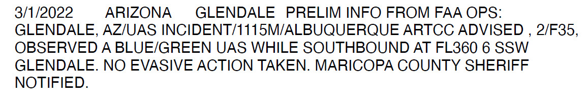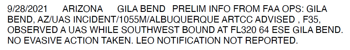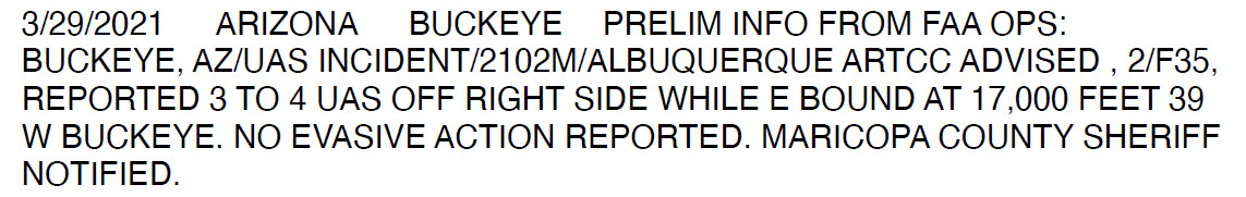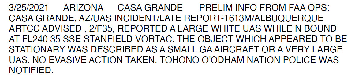 For example, on March 25, 2021, pilots in a pair of F-35s flying in the vicinity of Casa Grande, Arizona, which is situated between Pheonix and Tucson, “reported a large white UAS… at FL240 [24,000 feet],” according to one entry in the FAA logs. “The object, which appeared to be stationary was described as a small GA [general aviation] aircraft or a very large UAS.”