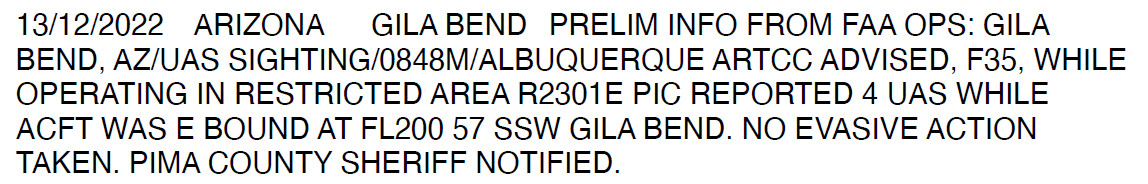 On December 13, 2022, FAA’s data says that the pilot of an F-35 flying in the eastern end of R-2301E, a section of restricted airspace within the Barry M. Goldwater Range (BMGR) complex, made a report about what they described as “4 UAS.” As seen below, that entry in FAA’s logs says “no evasive action [was] taken.”