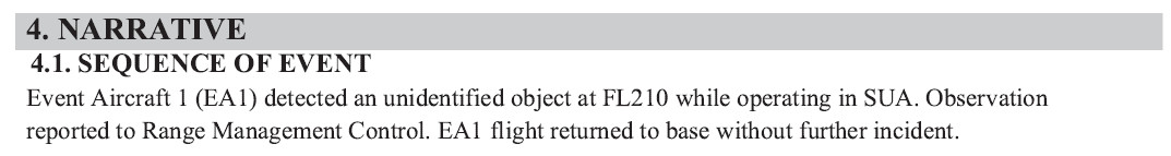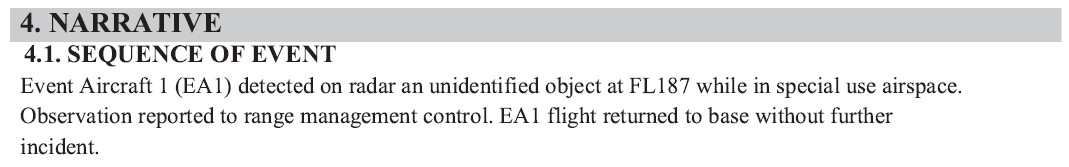 Sightings of unidentified objects continued into 2023. On January 5 of this year, a 56th Fighter Wing F-35 conducting a training sortie in the Gladden MOA made radar contact with another “unidentified object at FL187 [18,700 feet],” according to one of the released HATRs.