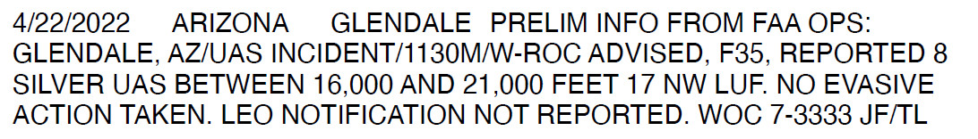 There have been a number of encounters between military aircraft and what are described as groups of craft flying together in the past three years or so in this specific part of the United States. For instance, on March 29, 2021, two pilots flying F-35s in the vicinity of Buckeye, Arizona, a suburb of Phoenix, made a report about “3 to 4 UAS off [the] right side while e[ast] bound at 17,000 feet,” according to the FAA. On April 22, 2022, another F-35 pilot reported “8 silver UAS [at an altitude of] between 16,000 and 20,000 feet” in the vicinity of Glendale, Arizona, another Phoenix suburb, another entry in the FAA’s logs says.