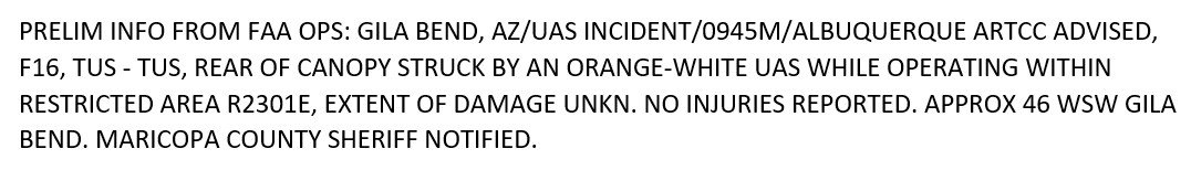 On January 19 of this year, an F-16 Viper fighter jet from an unknown unit flying in R-2301E actually collided in mid-air with “an orange-white UAS,” according to the FAA’s logs. The entry says the drone reportedly struck the fighter’s canopy, but the extent of the damage was initially unclear. The War Zone is currently working to obtain more information about this incident.