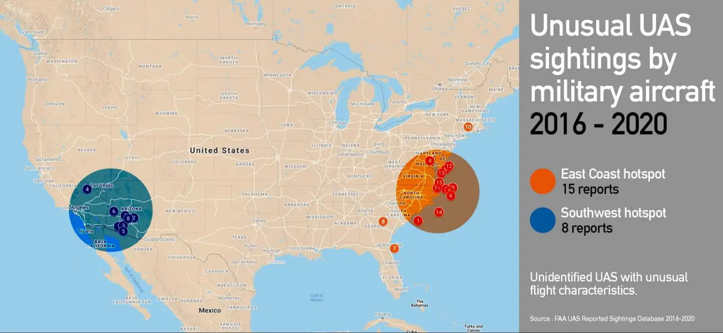 The events are described in reports from the Federal Aviation Administration (FAA) filed over roughly a three-year period. Overall, the data points to what are often categorized as drones, but many of which are actually unidentified objects, as well as what do appear to be drones, or uncrewed aerial systems (UAS), intruding into these restricted warning areas with alarming regularity.