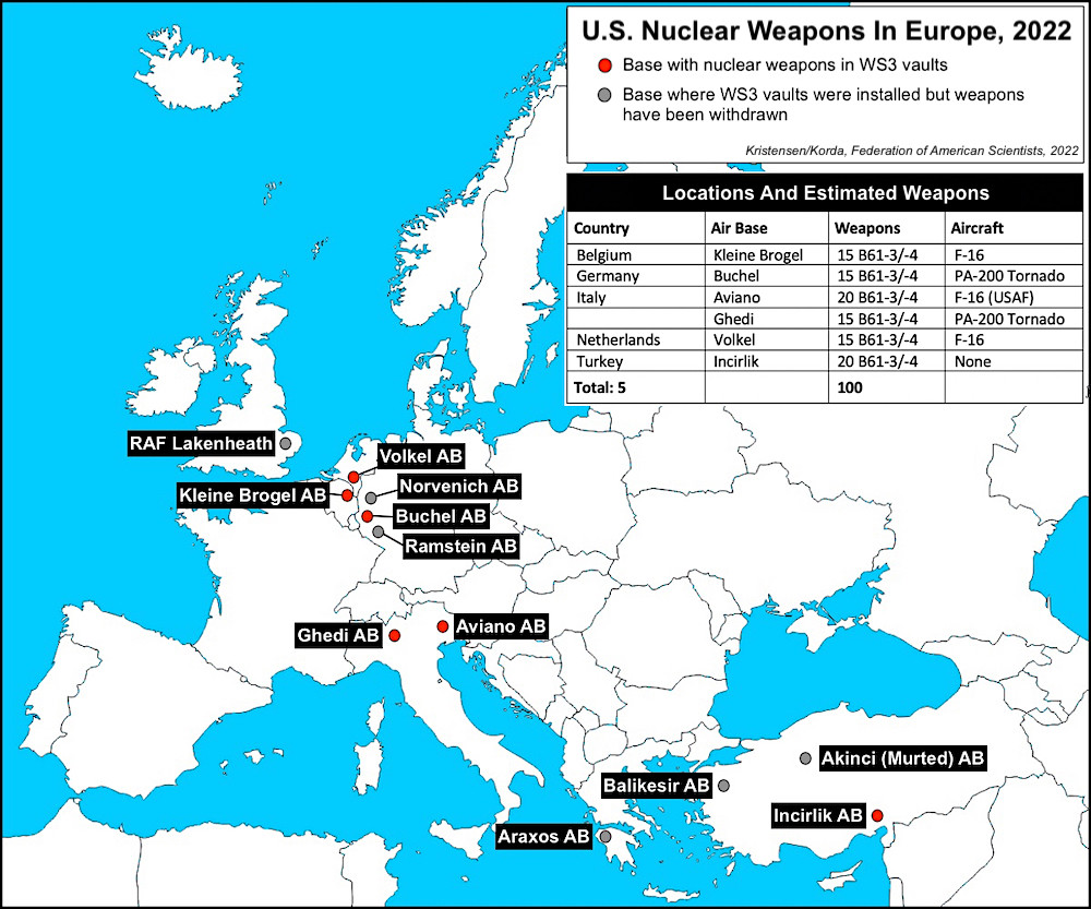 Specific details about the program are both classified and politically sensitive for many of the participating countries, a number of which do not even publicly acknowledge the presence of American nuclear weapons on their soil. As of last October, the Federation of American Scientists (FAS) estimated that around 100 B61s in total were spread across six bases in five countries – Belgium, Germany, Italy, the Netherlands, and Turkey. There have been estimates as high as between 150 and 200 bombs in the past.
