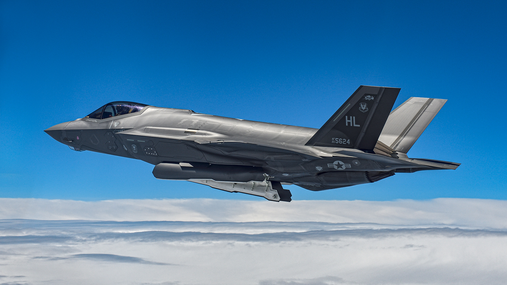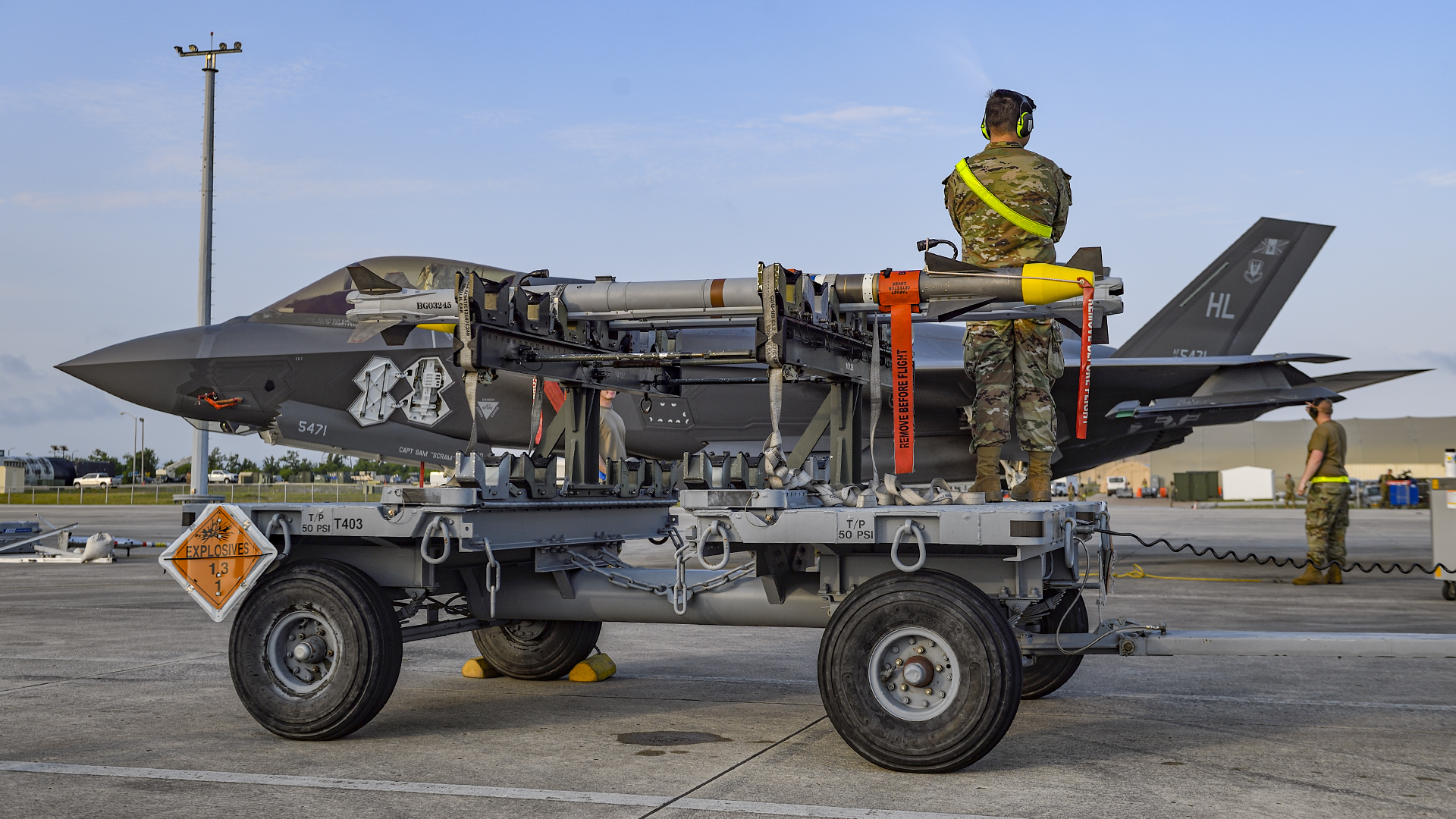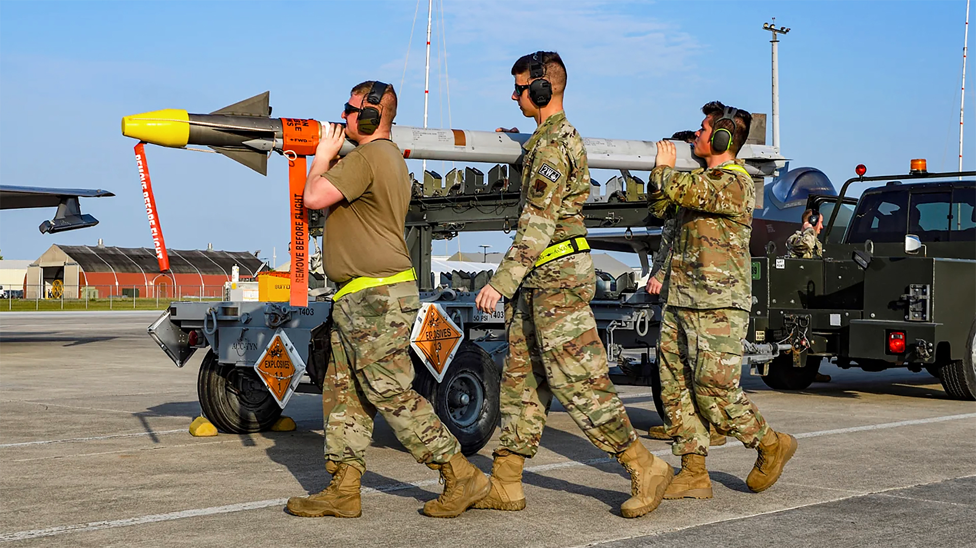 A green munitions truck slowly makes its way down the line of fighters at Tyndall Air Force Base, Florida, towing a rack that is packed with AIM-9X Sidewinders and AIM-120 Advanced Medium-Range Air-to-Air Missiles (AMRAAMs). Some of the AMRAAMs feature a yellow band, denoting a live warhead, but most have the warhead replaced by a telemetry kit. This will tell the experts on the ground exactly how the missile performs when it’s fired.