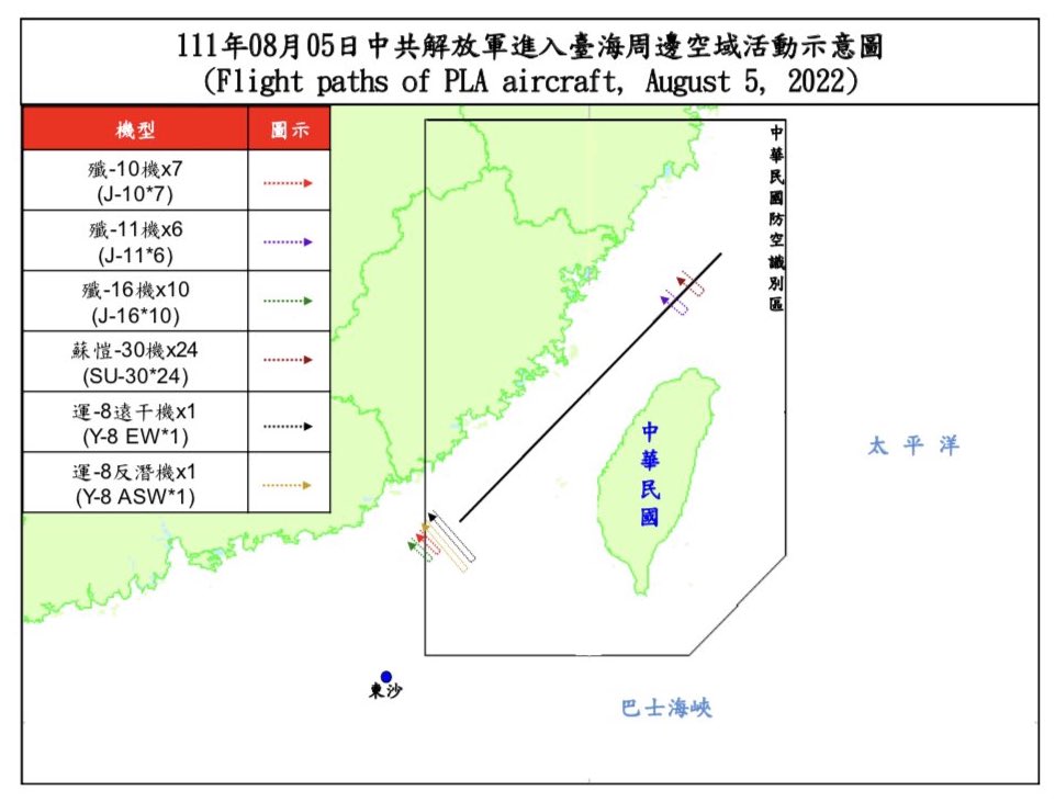 Aside from aircraft and ships, the PLA has reportedly also continued to test missiles, after the launch yesterday of DF-15 SRBMs, as many as four of which flew over Taiwan’s capital, while five landed in Japan’s exclusive economic zone (EEZ), according to the Japanese Ministry of Defense. This led to a diplomatic protest by Tokyo.