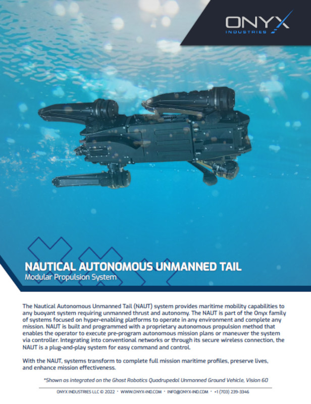 “Onyx Industries and Ghost Robotics first publicly unveiled the NAUT and the Vision 60’s maritime capabilities at the 2022 Special Operations Forces Industry Conference and generated great interest. Onyx aims to serve both the defense and commercial markets with the NAUT’s capability, as it enables the Vision 60 to be an indispensable maritime tool for any human operator that wishes to extend their reach and keep humans out of harm’s way,” Onyx Industries’ Pyle added. “Onyx is currently engaging with end-users from the United States and abroad, from the Special Operations community to the logistics industry.”