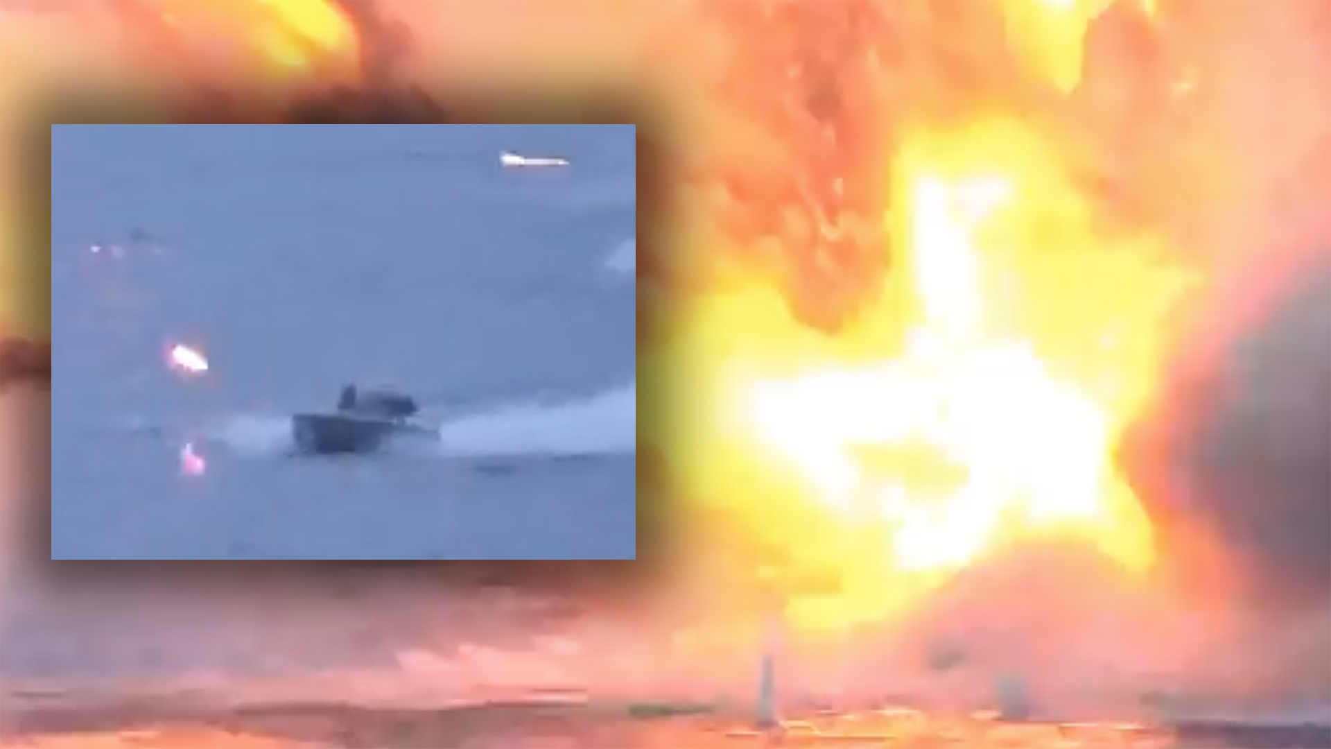 The video, published by the MoD’s official Zvezdanews outlet, shows the last seconds of what it says was a Ukrainian USV approaching the Ivan Khurs. Several tracer rounds, apparently from deck-mounted 14.5mm machine guns, are observed narrowly missing the USV before it turns and is struck on the bow, exploding in a tremendous fireball.