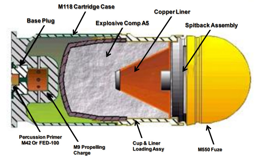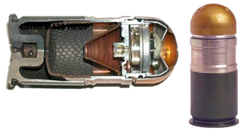 The bomblet appears to be based around a grenade for use in 40mm grenade launchers combined with a black-colored tail assembly. The gold-colored tip of the grenade points to it being a high-explosive dual-purpose (HEDP) type. A typical HEDP 40mm grenade features a shaped charge designed to penetrate through relatively light armor, as well as a body designed to turn into a hail of deadly fragments that present a threat to unarmored vehicles and personnel.