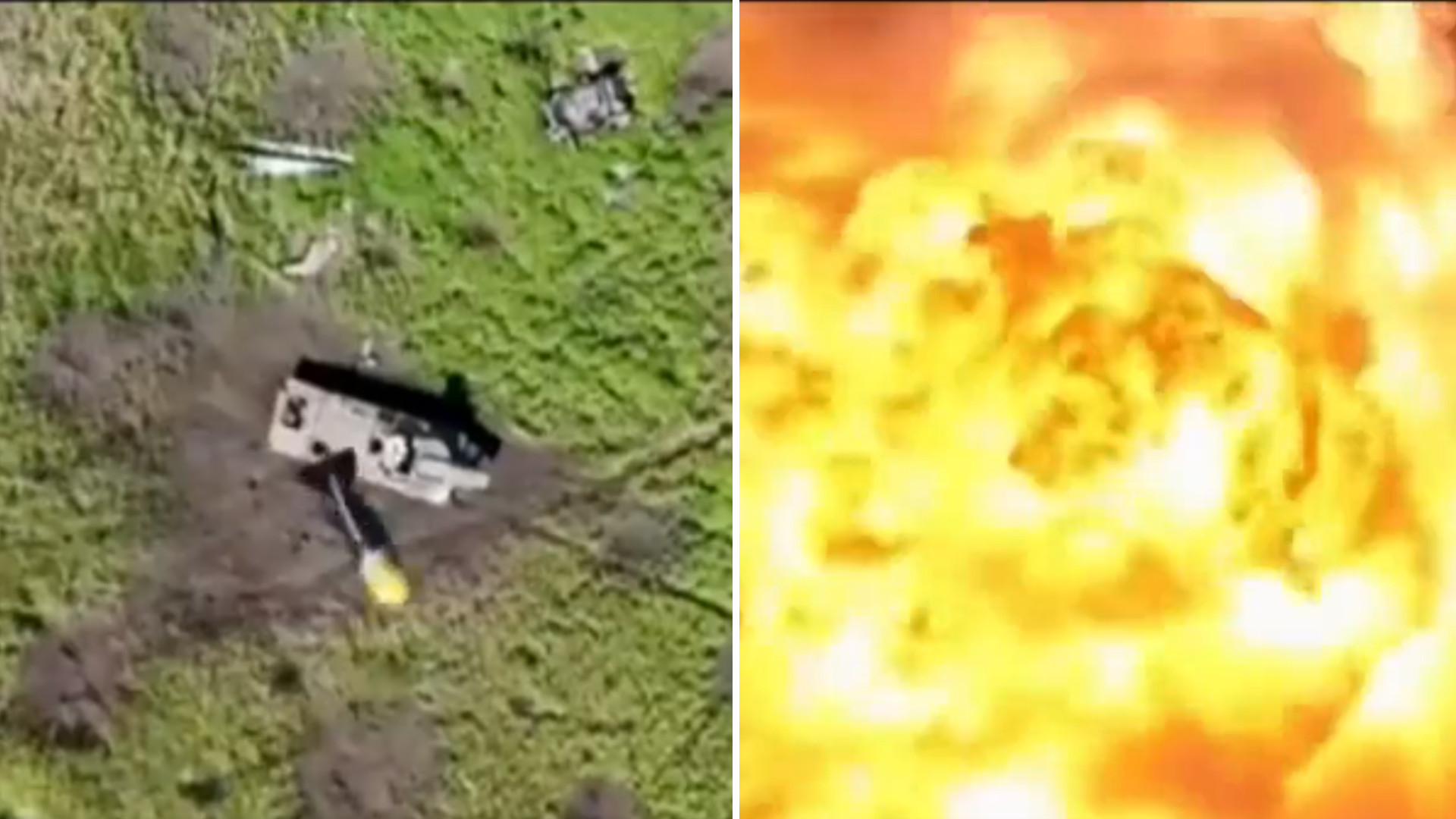 Ukrainian forces have destroyed a Russian UR-77 Meteorit mine-clearing vehicle in a spectacular fashion using an improvised munition dropped from a drone. The small bomblet causes a massive secondary explosion that obliterates the vehicle.