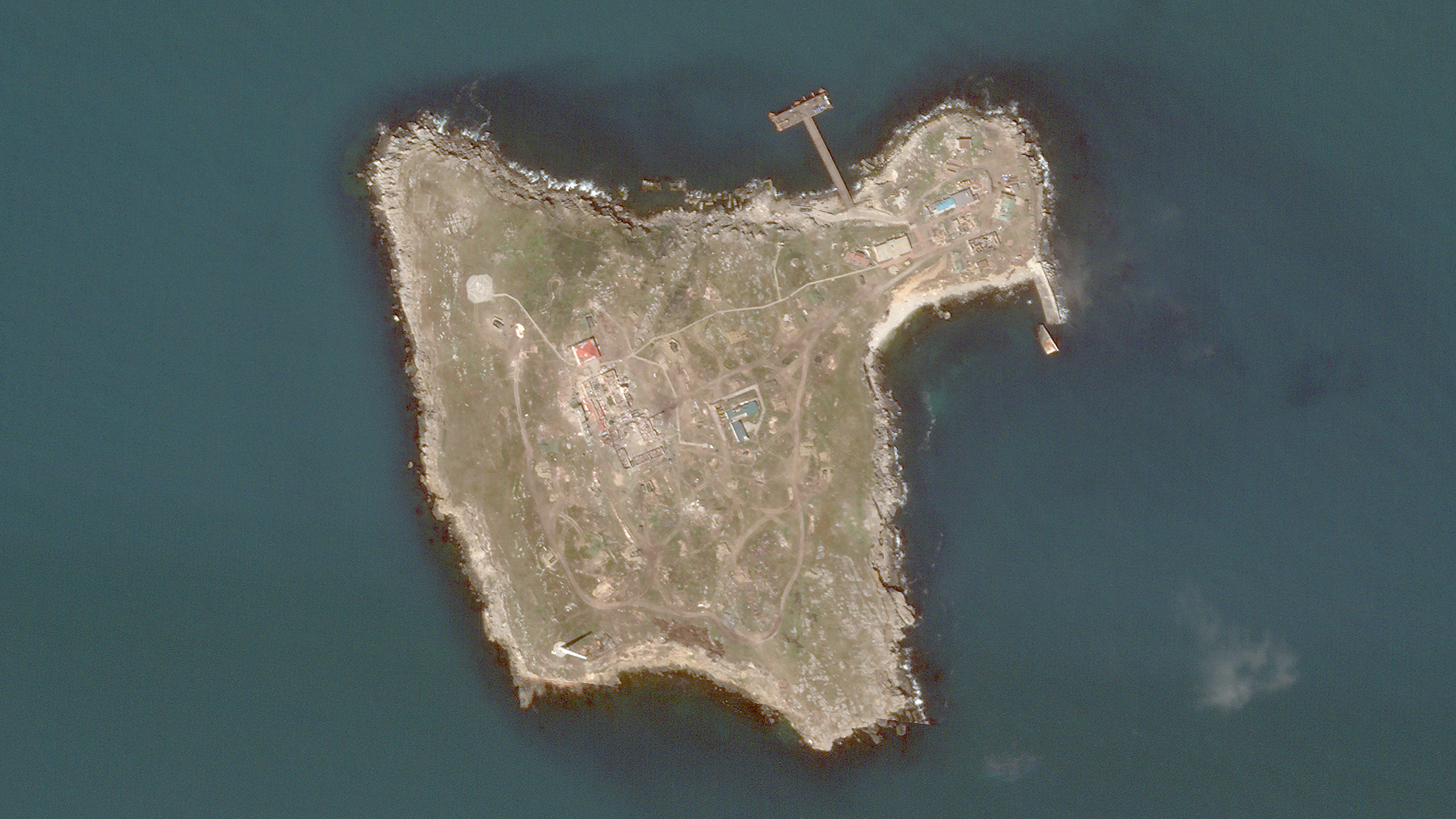 A cursory examination of a satellite image The War Zone obtained from Planet Labs shows at least one new vehicle situated near the NE village/port area. Imagery also shows what appears to be a similar Tor system on deck of a Dyugon class (Project 21820) landing craft pictured at about 1.7 miles directly south of the island.