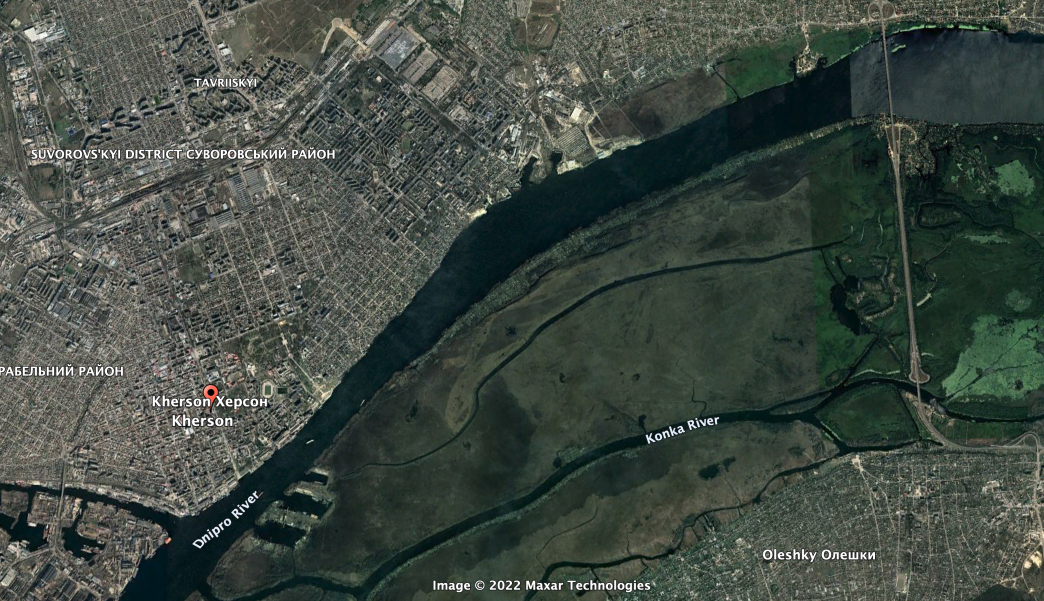 The river is about a half-mile wide and sometimes even wider at some points near Kherson City. During its Kherson Oblast counteroffensive, Ukrainian forces frequently bombarded Russian river crossings via precision strikes from the M31 guided rockets fired by the HIMARS system, impeding their efforts to resupply the city. The Antonivsk Bridge — the highway crossing in Kherson — has been out of action for months. The rail bridge upriver has also been knocked out. Even the pontoon bridge Russia built next to the Antonivsk Bridge has come under constant attack, something you can read more about here.