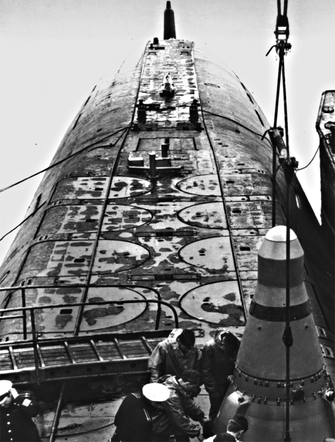 Finally, on December 18, 1969, K-140 was put out to sea with 16 honorable guests on board, including V. P. Makayev, the chief designer of the R-27 Zyb SLBM. After arriving at the selected exercise area, within sight of the shore, K-140 submerged to periscope depth to begin preparations for the launch. After completing all pre-launch checks, the submarine dived to the launch depth of around 160 feet (50 meters), commenced hovering at a speed of 3.5 knots, and the commander gave orders to pressurize the first four missiles. At approximately 08:30 A.M. the weapon control system confirmed launch readiness, four hatches slowly opened, and the first missile was launched, followed in seven-second intervals by the second, third, and fourth. The initial salvo took one and a half minutes to complete, and all missiles were now following their pre-programmed trajectory.