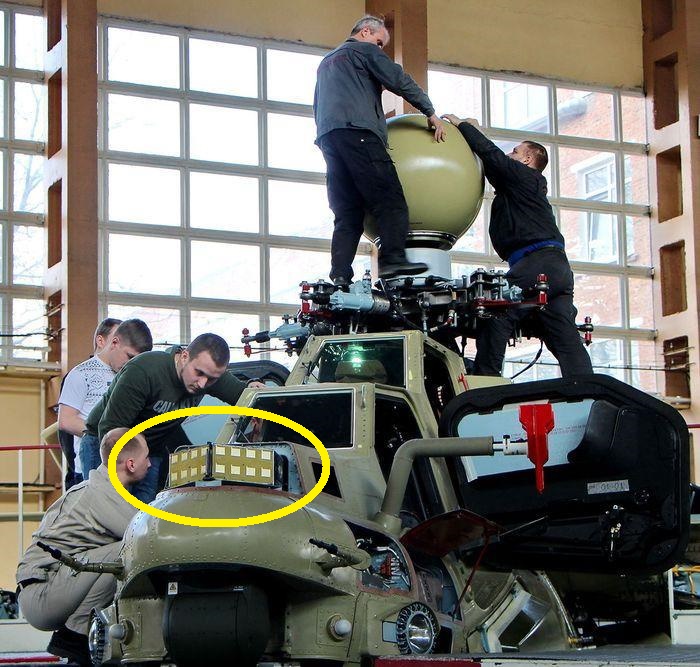 A novelty of the LMUR, compared to Russia’s other helicopter-launched anti-tank missiles, is a two-way datalink connecting the missile to the helicopter. The missile flies to the target area guided by inertial autopilot with course correction provided by the satellite navigation system. Once close to the target, the image from the missile’s thermal-imaging seeker is transmitted to the helicopter operator’s cockpit by the datalink, and guidance commands are transmitted back to the missile. The operator can select a target for the missile. To communicate with the missile, the helicopter uses the AS-BPLA system. In the Mi-28NM, its antenna is built into the top of the front fuselage, while the Ka-52M carries it in a teardrop-shaped pod suspended under the left wing.