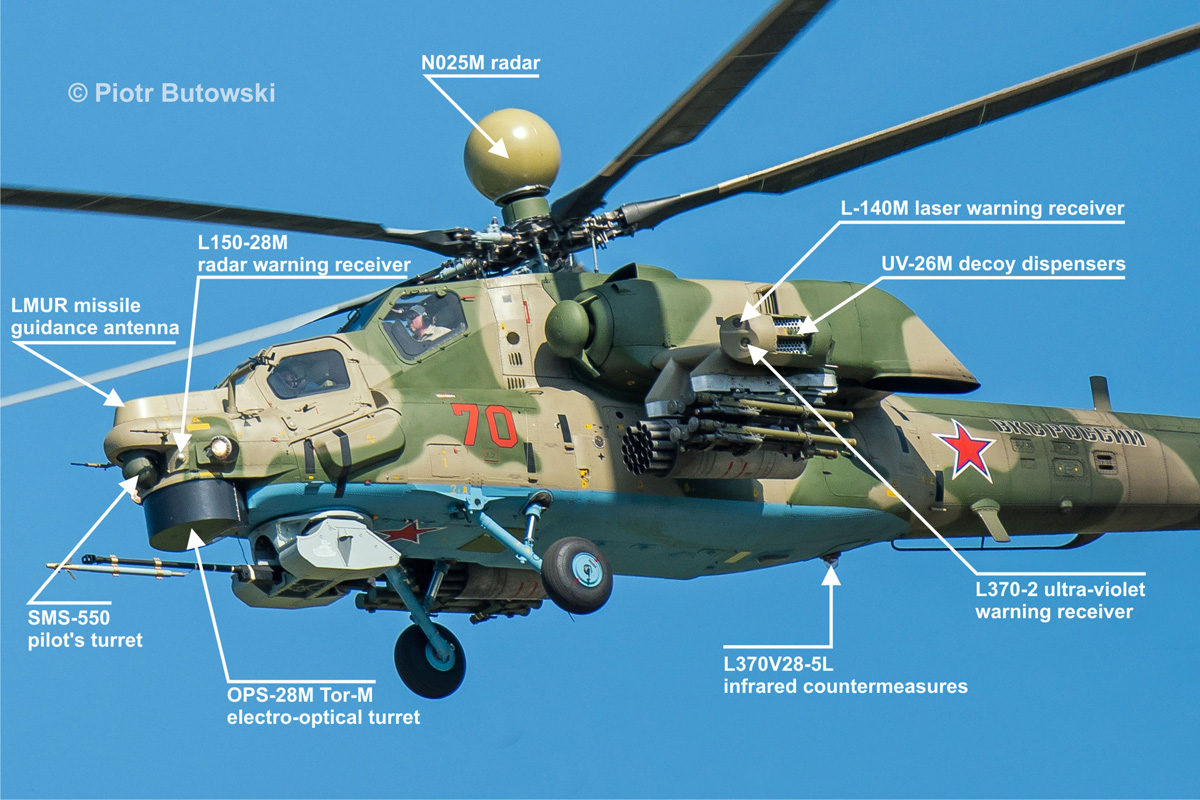 The Mi-28NM’s L370V28 Vitebsk self-defense suite combines L150-28M radar, L-140M laser, and L370-2 ultra-violet warning receivers, a countermeasures-launching system, and an L370V28-5L laser-based directional infrared countermeasures (DIRCM) system. A new KSS-28NM (S-406-2NM) communication suite enables the helicopter to operate within the army’s aviation command system.
