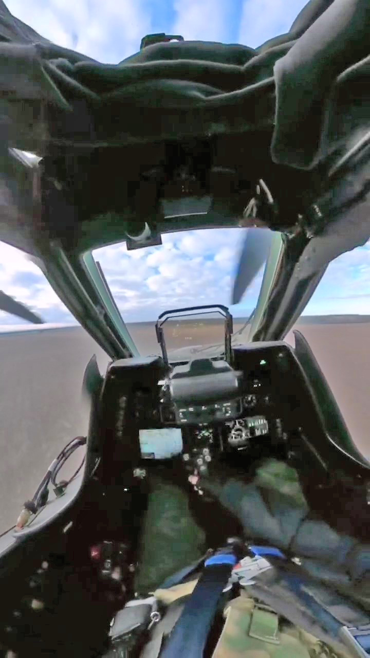 The video shows the interior of the Mi-28NM pilot’s cockpit (but not the front operator’s position). This looks similar to the standard Mi-28N cockpit, with two multifunction displays arranged side-by-side and a set of basic analog instruments. A new addition is the ILS-28NM head-up display, which has a less substantial framework than the previous ILS-28M.