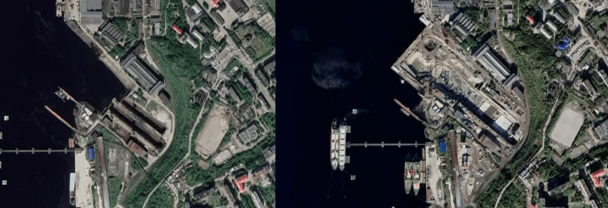 At the time of that transfer to the drydock, it was said the goal was to complete the overhaul no later than September 2022. The new, improvised drydock was created by joining together two smaller drydocks and then also constructing an extended enclosed basin in front of them.