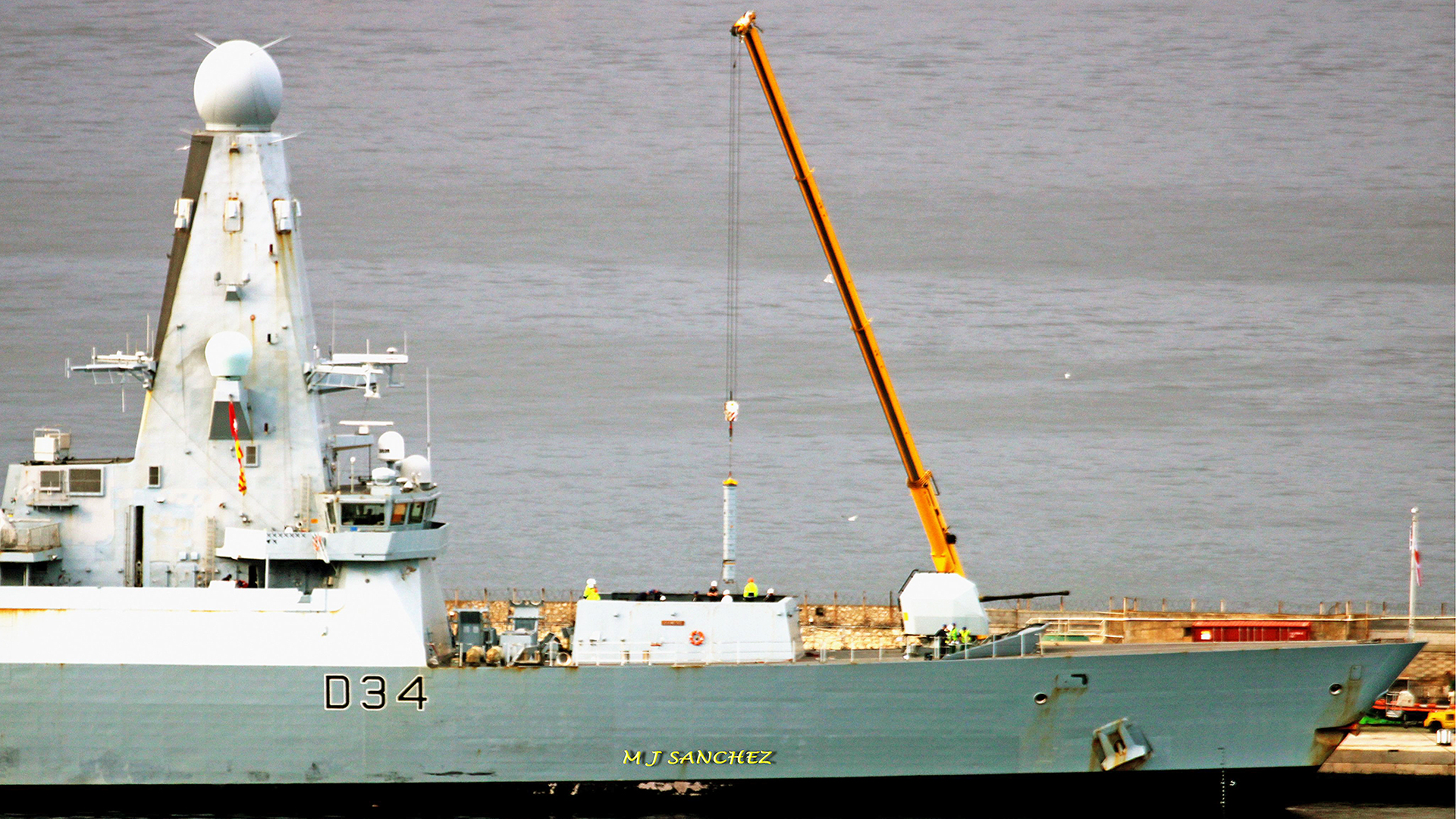 Images of the ship being replenished with missiles come from us from Michael Sanchez, who keeps a close eye on naval happenings at and in the vicinity of Gibraltar, and William Jardim. It shows the vertical launch cells on the ship’s bow being reloaded via a crane with Sea Viper all-up rounds.