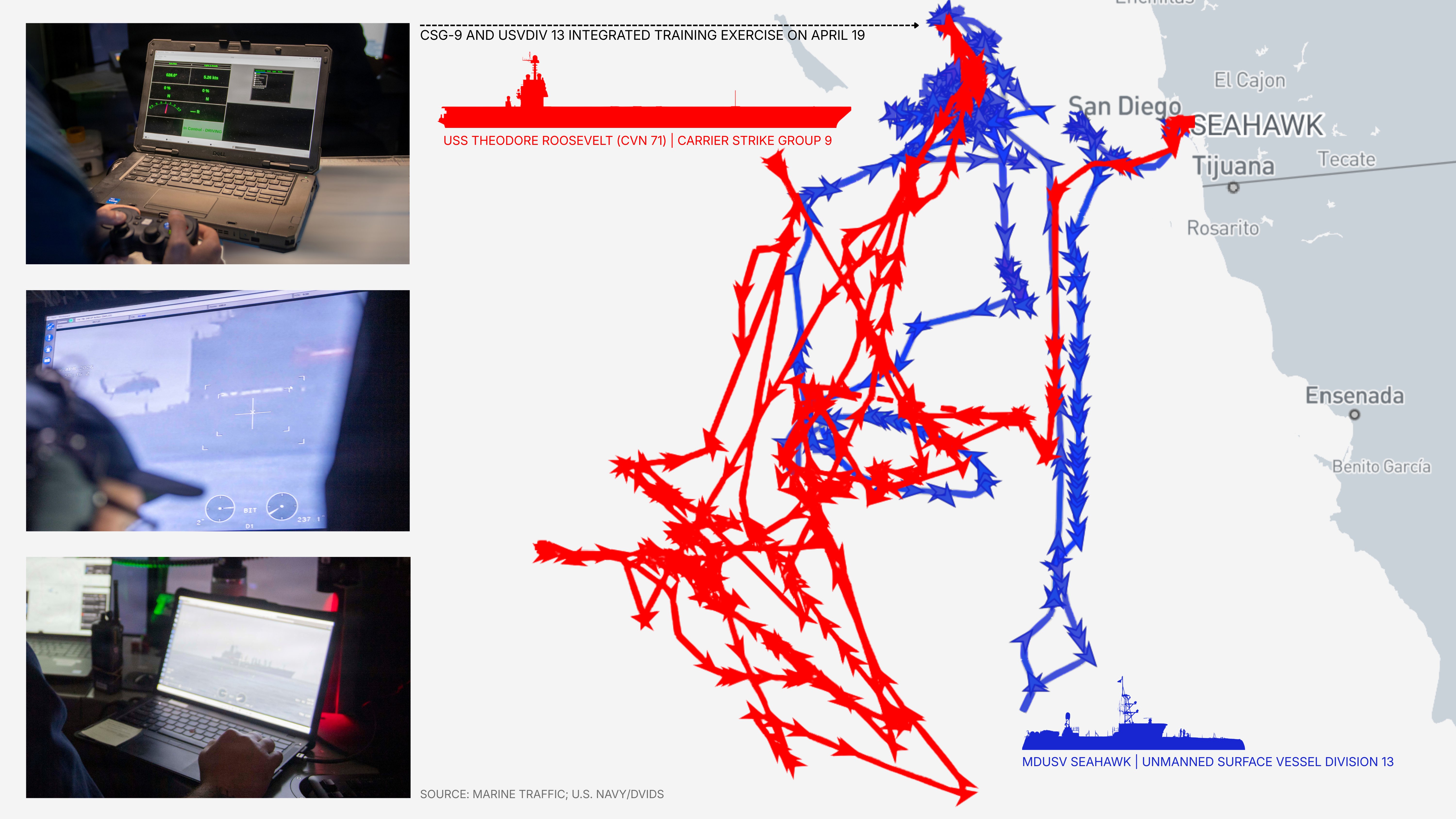 The Theodore Roosevelt CSG (TRCSG) is working up in U.S. 3rd Fleet AOR, a spokesperson told us. There are several notable aspects of the training, including integration with an Unmanned Surface Vessel Division (USVDIV) operating a medium USV (MDUSV) Seahawk, as well as the potential test of new Raytheon Coyote and Longbow Hellfire missile launchers, which TWZ first reported here. In February, Vice Adm. Brendan McLane told reporters that a medium drone would deploy alongside TRCSG later this year, Breaking Defense reported, and the Seahawk may be set to assume that role. There has been a flurry of naval drone activity off the California coast, including the NOMARS USX-1 Defiant, based on public AIS data from Marine Traffic. Roosevelt is at the leading edge of the Navy’s “tailored force pairing” concept – which could include integrating naval drones into CSG operations – and Seahawk appears to be the MDUSV selected to train and potentially deploy with the group.