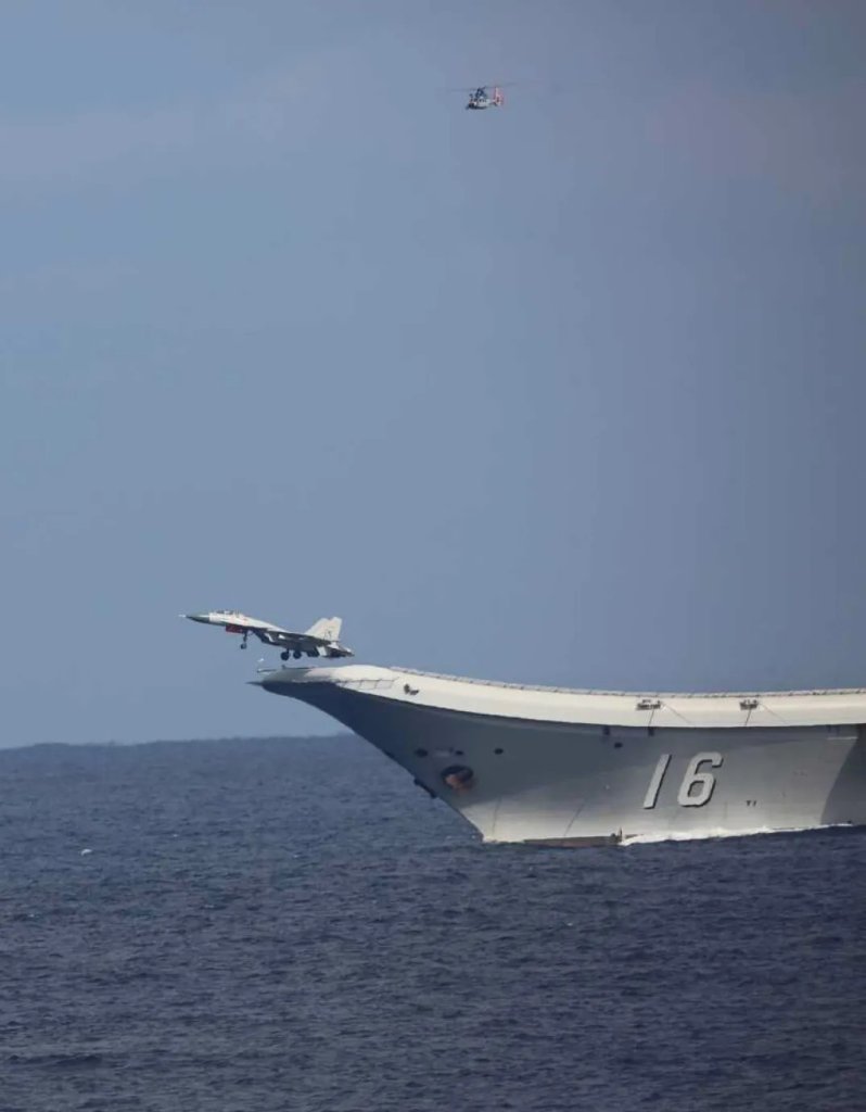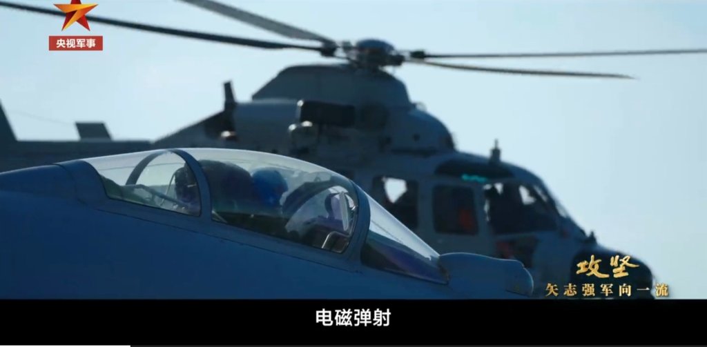 Another clip shows the shadow being cast on Fujian‘s deck from a J-15-series fighter flying low over or at least very near the ship. There are no clear indications, one or the other, that the jet in question took off from and/or landed on Fujian.