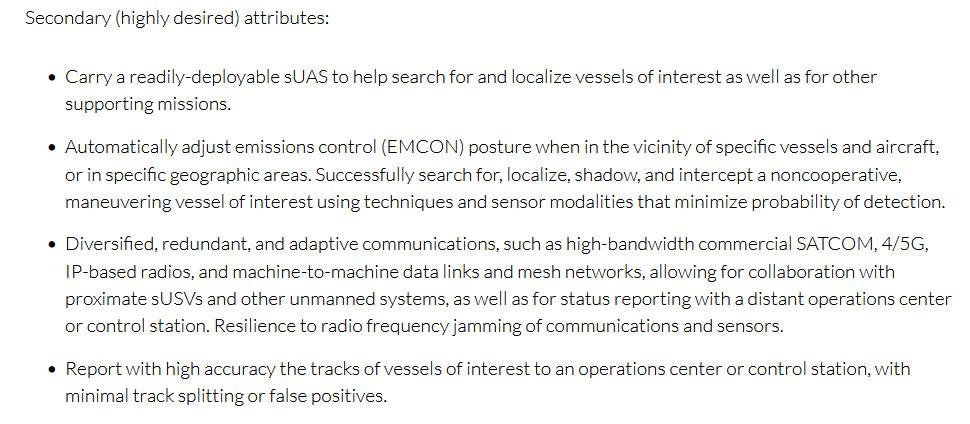 “Automated contact recognition for classifying and identifying surface vessels of various types, to include recognition of hull shape, superstructure, masts, and hull markings such as letters and numbers,” is among the tertiary attributes. There is also interest in the “ability to accept a variety of modular payloads, sensors, and effectors.”