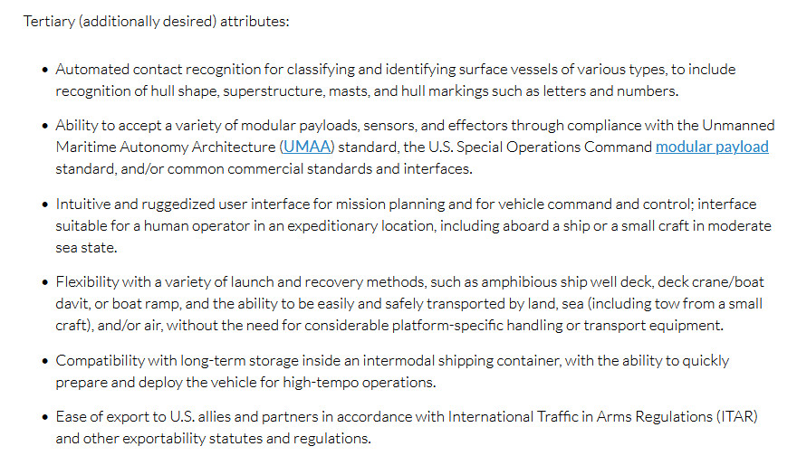 “Flexibility with a variety of launch and recovery methods, such as amphibious ship well deck, deck crane/boat davit, or boat ramp, and the ability to be easily and safely transported by land, sea (including tow from a small craft), and/or air, without the need for considerable platform-specific handling or transport equipment,” is also a tertiary interest. So is “compatibility with long-term storage inside an intermodal shipping container, with the ability to quickly prepare and deploy the vehicle for high-tempo operations.”