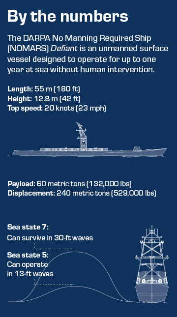 “Defiant is a tough little ship and defies the idea that we cannot make a ship that can operate in the challenging environment of the open ocean without people to operate her,” Greg Avicola, the NOMARS program manager, said during the recent christening ceremony, according to a press release. “While relatively small, Defiant is designed for extended voyages in the open ocean, can handle operations in sea state 5 with no degradation, and survive much higher seas, continuing operations once the storm passes. She’s no wider than she must be to fit the largest piece of hardware, and we have no human passageways to worry about.”