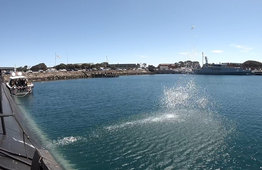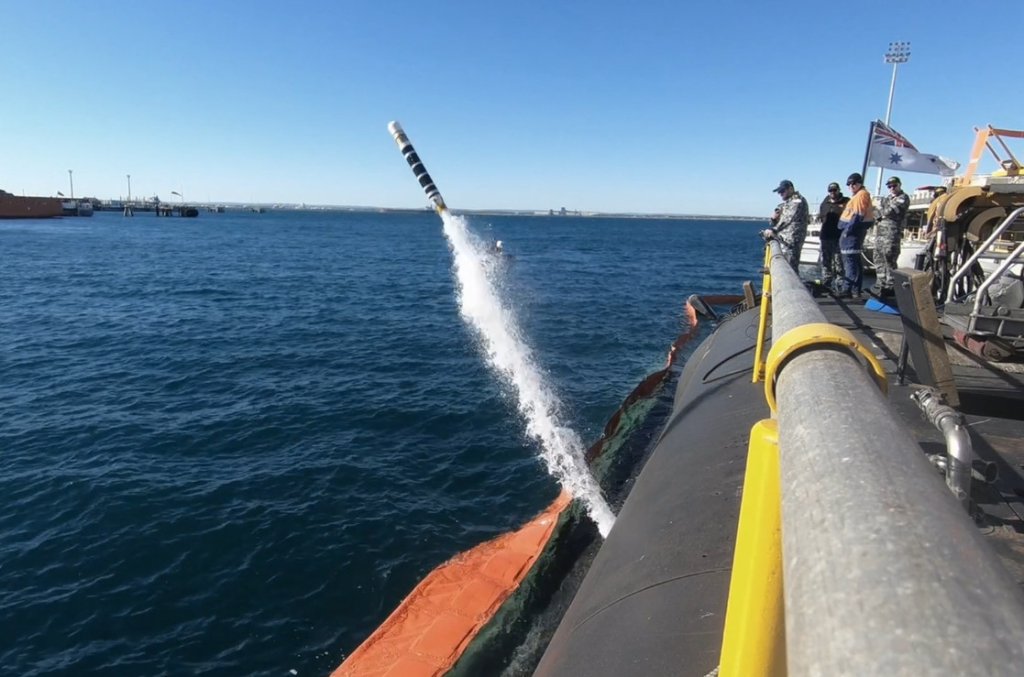 There are two clips showing the apparent launch of a payload from the hull of what may be a docked RAN Collins class submarine based on a flag seen in the background. What is being fired and why is not entirely clear, but it has a torpedo-like outward appearance and could be an expendable countermeasure of some kind. The U.S. Navy and others have also been actively working on submarine-launched aerial drones and UUVs, including types small enough to be launched from existing countermeasures launchers.