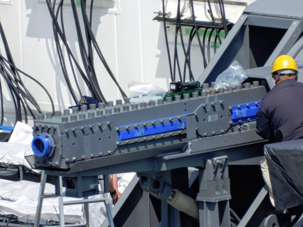 The pictures show the shroud around the railgun removed so that work can be performed on the weapon inside. This confirms that the railgun installed in the turret on Asuka is extremely similar, if not identical, to a prototype that the Japanese Ministry of Defense’s Acquisition, Technology & Logistics Agency (ATLA) has been testing on land and sea for a number of years now. TWZ had posited that this was likely the case based on what was visible in previous available imagery. How exactly the design may have evolved over the years is unclear.