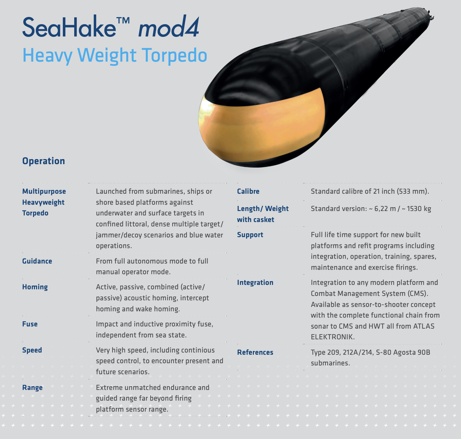 “DM2A4 SeaHake Mod 4 was designed with modularity in mind, i.e. the capsulated battery allows very short activation time and the ability to launch a torpedo with 2 up to 4 battery units,” Smutny said.