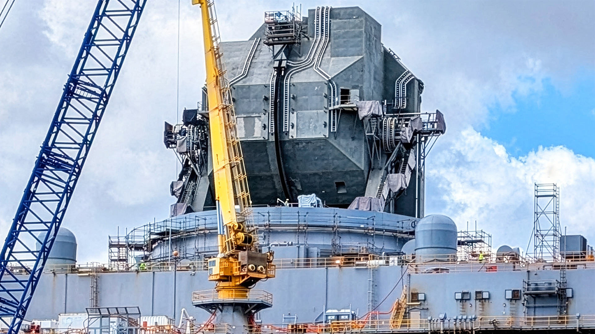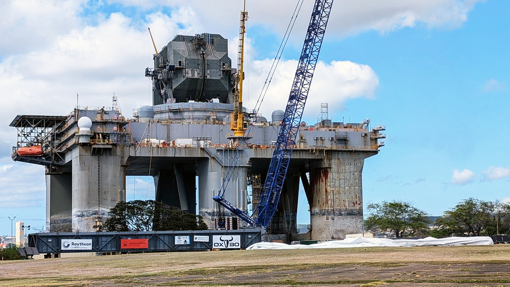 What’s drawing attention, even among locals who are used to seeing the bizarre-looking engineering marvel jutting up out of Pearl Harbor, is its centerpiece radar being exposed to the elements — which is a very rare occurrence.