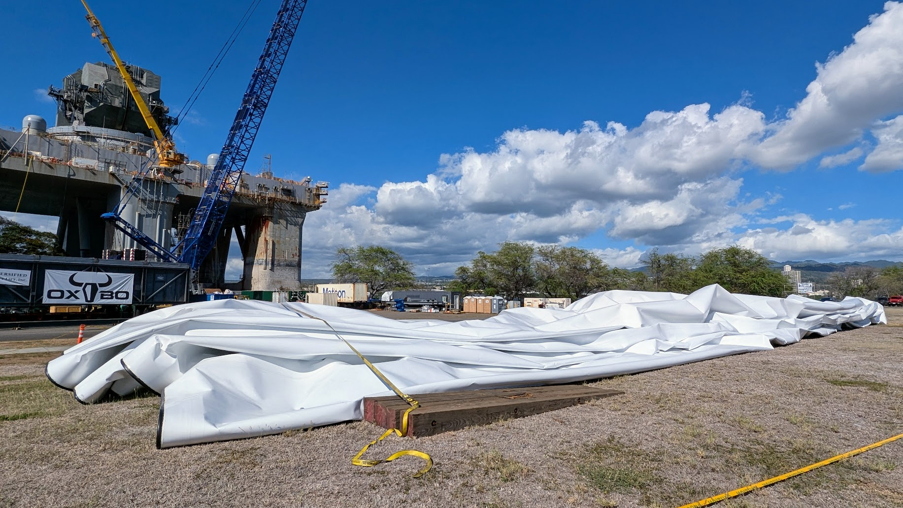 The SBX-1 goes into Ford Island, which sits across from the Navy’s prime port facility, every 12 to 18 months, Joseph Davila, a Military Sealift Command spokesman, told us. However, the protective dome has never previously been deflated, according to Davila.