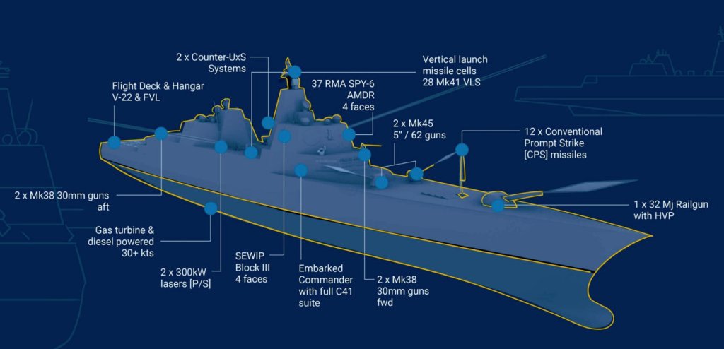 The ship’s main gun armament will consist of a 32-megajoule electromagnetic railgun along with two 5-inch naval guns. How the Navy will source the railgun is unclear. The service halted its most recent work on naval railguns, at least publicly, in the early 2020s.