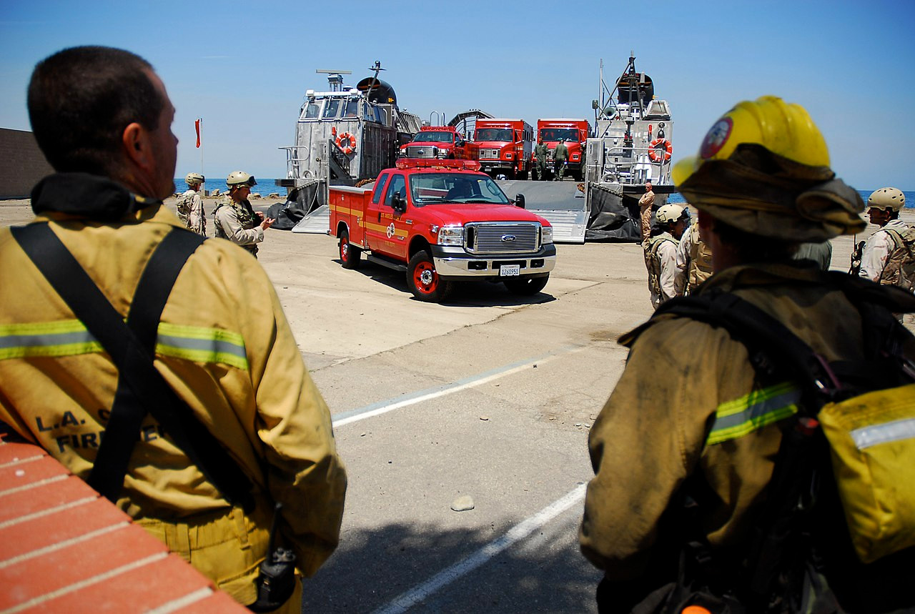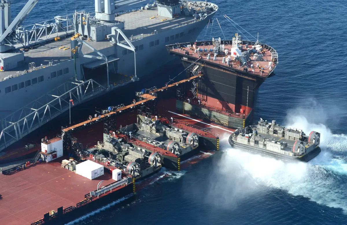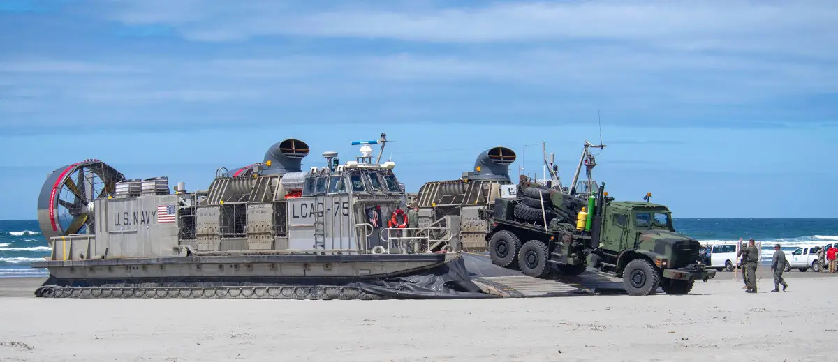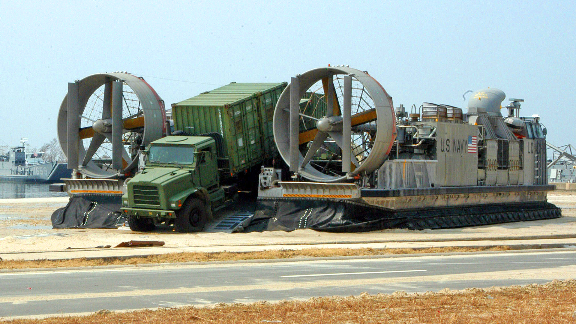 “The Landing Craft, Air Cushion (LCAC) is a high-speed, over-the-beach, fully amphibious landing craft capable of carrying a 60-75 ton payload,” according to the Navy’s official fact sheet on the hovercraft. That payload can include various kinds of vehicles, including cargo trucks, which can drive right onto the beach or onto a dispersal area after the LCAC arrives.