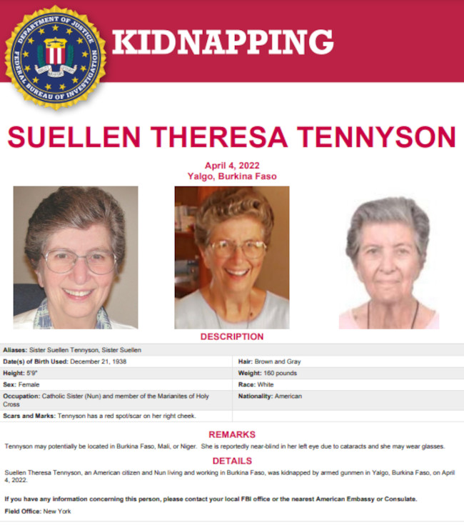 The Catholic Archdiocese of New Orleans and Bishop Theophile Nare of the Kaya Diocese in Burkina Faso both subsequently issued statements about the release of Sister Tennyson. The nun is a member of the order of the Marianites of the Holy Cross who had been serving in a parish in Burkina Faso since 2014. She was abducted by unknown gunmen in April.
