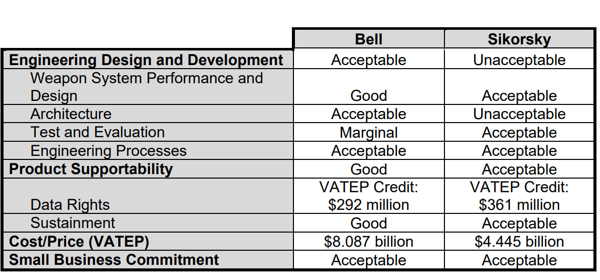 The total projected cost was one of a number of key factors the Army used to evaluate both offers. The table below provides a general overview of major criteria the service used to assess the offers from Sikorsky/Boeing and Bell and how they were rated in the end on these points.