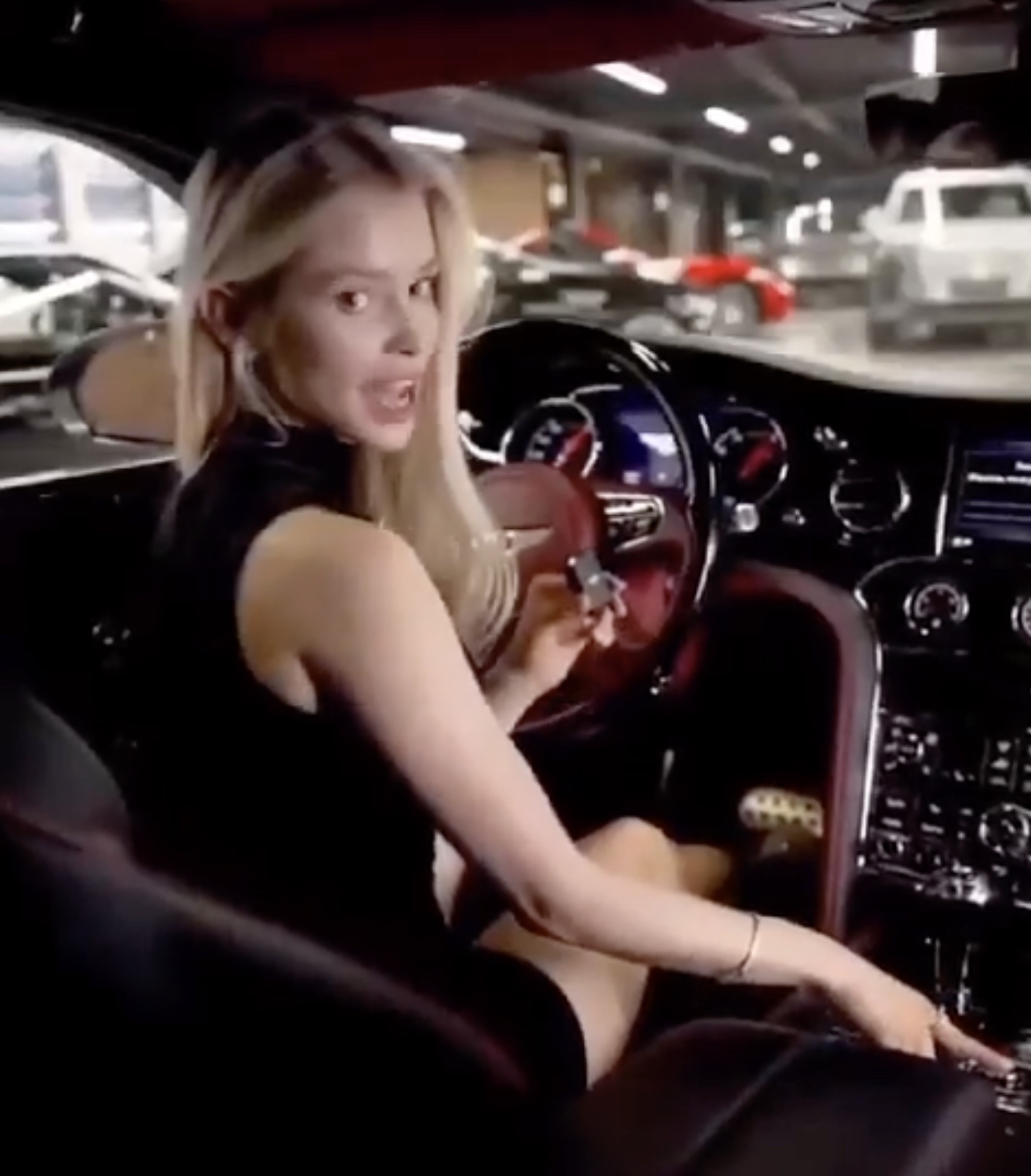Starting at the front of the vehicle, we’re treated to the juxtaposing sounds of the model tapping the Bentley’s solid metal “Flying B” hood ornament and Butterworth’s hollow-sounding tap on the Humvee’s ultra-utilitarian hood.