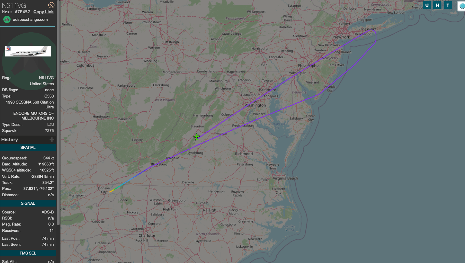 It appears this was a live intercept of a NORDO (non-responsive to radio calls) Cessna Citation 560 business jet. The aircraft began its journey out of Elizabethton Municipal Airport in Tennessee, flew over Long Island, before turning back directly toward Washington, D.C. The aircraft was intercepted and flew directly over the Capital before crashing near Staunton, Virginia. It is unclear if the aircraft went down on its own accord or was shot down over the rural countryside.