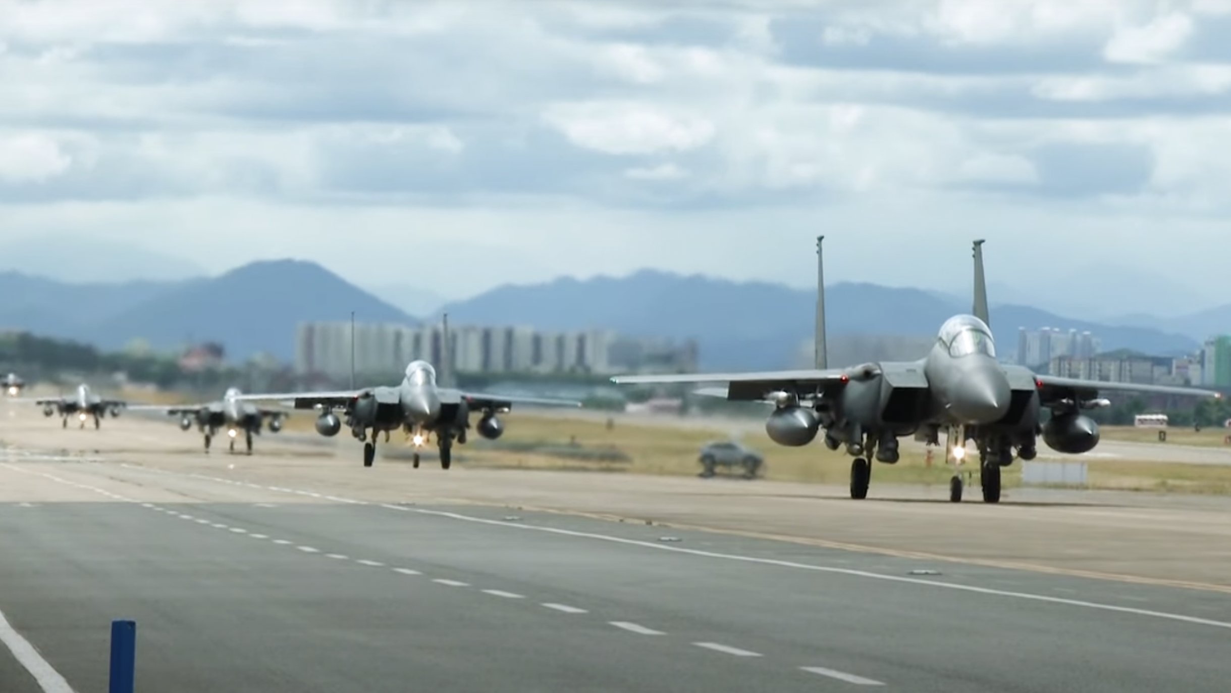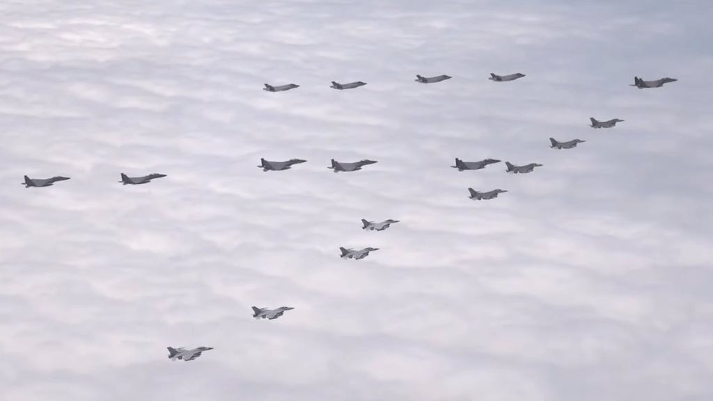 According to South Korean accounts, the formation comprised 16 F-35A, F-15K, and F-16 fighters from the ROKAF as well as four USAF F-16s from the 8th Fighter Wing, the “Wolf Pack,” which is permanently based at Kunsan Air Base in Korea. Alongside the 51st Fighter Wing at Osan Air Base, this wing has a primary task of deterring North Korean aggression. Based on official imagery, most of the aircraft appeared to be carrying external weapons and stores — this obviously can’t be established for the F-35 stealth jets, with their internal weapons bays.