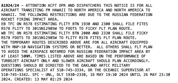 “This notice is for all aircraft transiting from Hawaii to North America and North America to Hawaii. The following restrictions are due to Russian Federation rocket firing impact area,” the NOTAM read, perhaps sparking confusion.