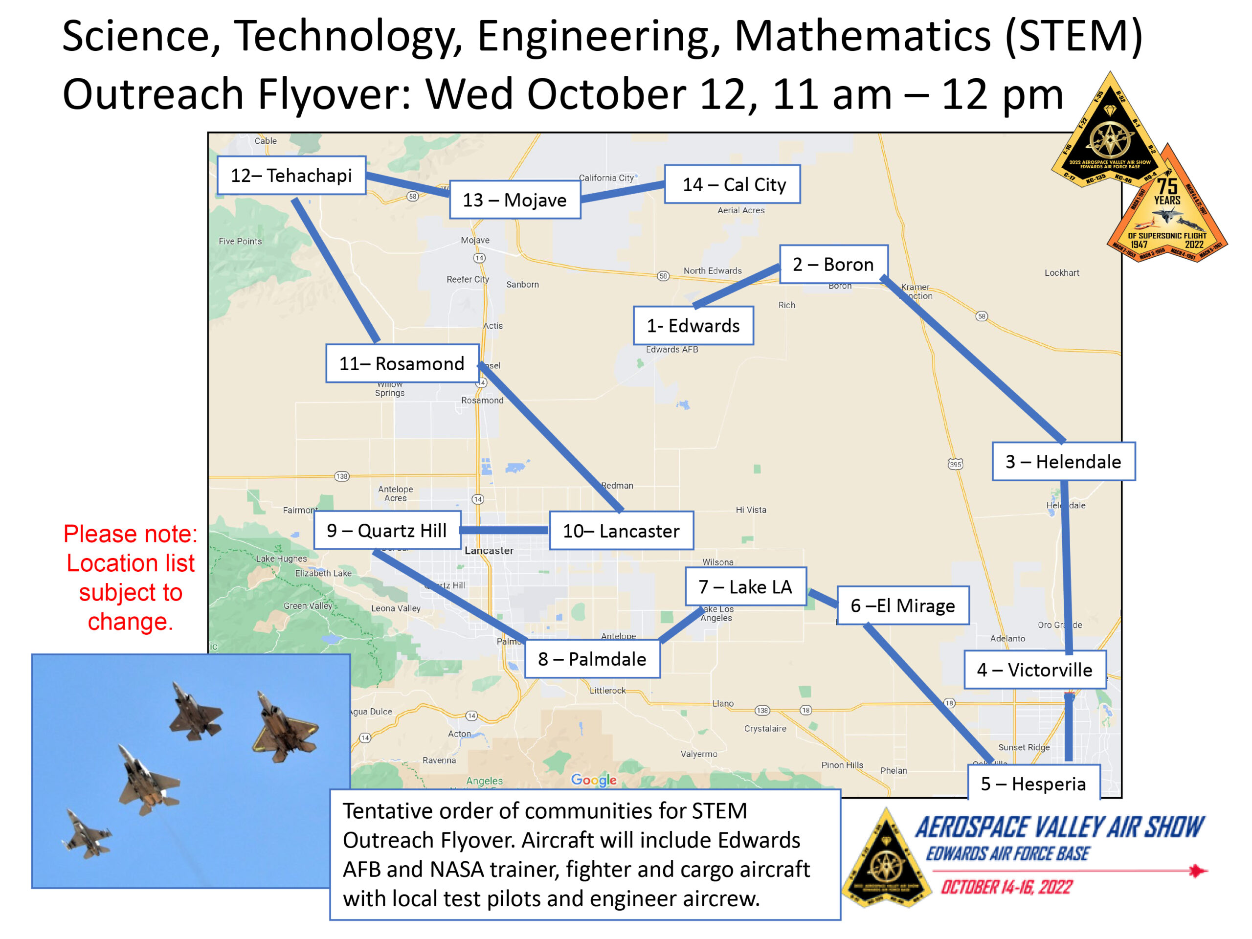 With designated waypoints at schools ranging from kindergartens to colleges, the flyover route included the Californian towns of Edwards, Boron, Helendale, Victorville, Hesperia, El Mirage, Lake Los Angeles, Palmdale, Quartz Hill, Lancaster, Rosamond, Tehachapi, Mojave, and California City.