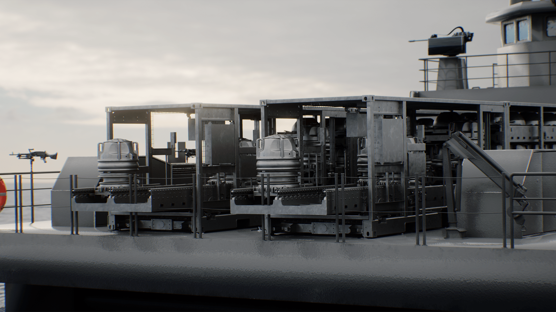 SH Defense and Kongsberg are working on the Naval Strike Missile [NSM] that’s in a container. We can put four of those containers on the back deck, so that’s 16 NSMs on one boat. We also have three pedestal areas on the vessel for larger 30 millimeter autocannons for peripheral defensive and offensive roles – this is not a sitting duck.