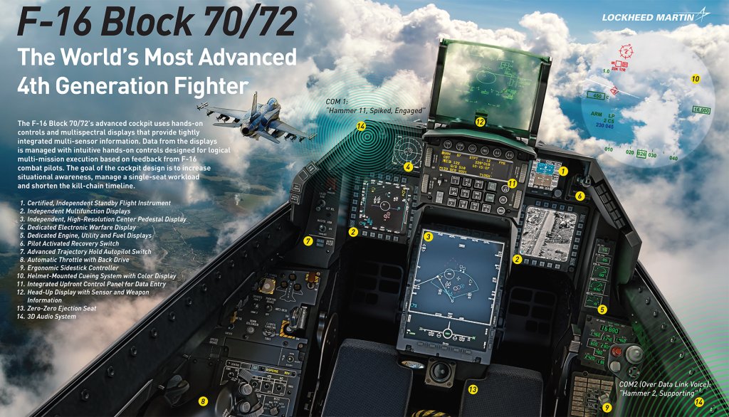“Additionally, the new avionics in the Block 70/72 allow simultaneous operation of those systems from the front seat and the back seat of the two seat F-16D, whereas legacy F-16s gave the back seater a simple repeater of the other cockpit’s information. Now, both individuals in the plane can simultaneously interact with it in a way that’s never happened before.”