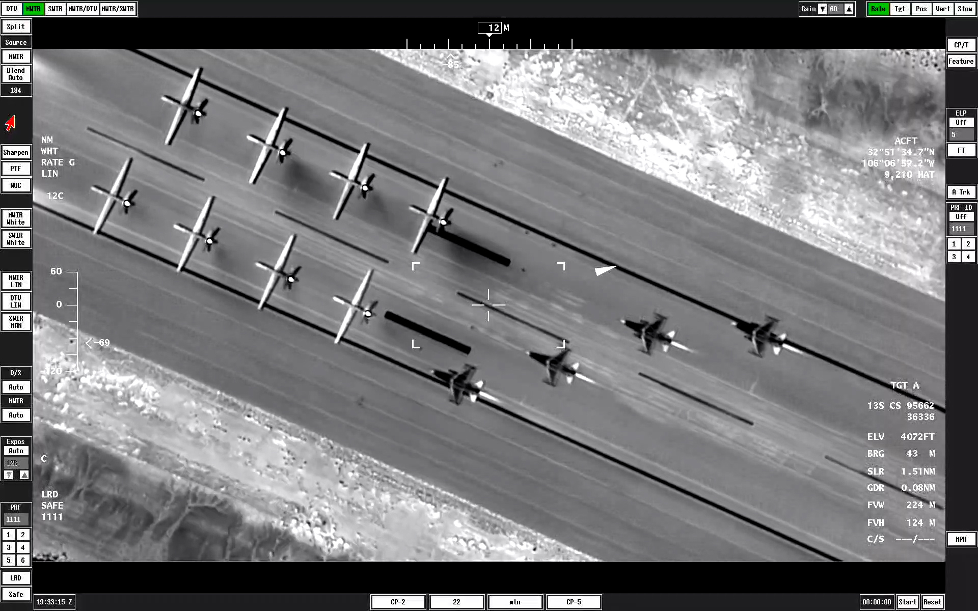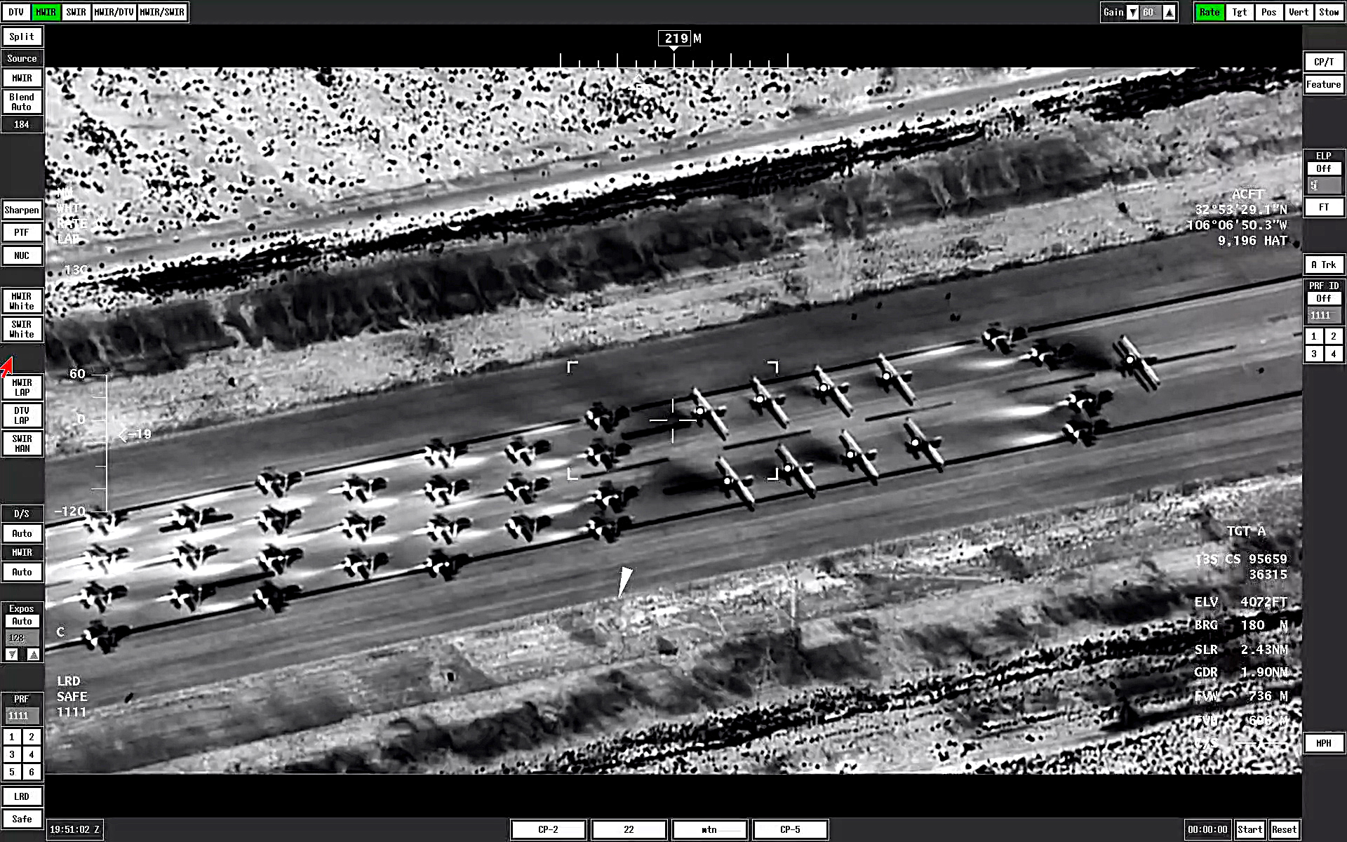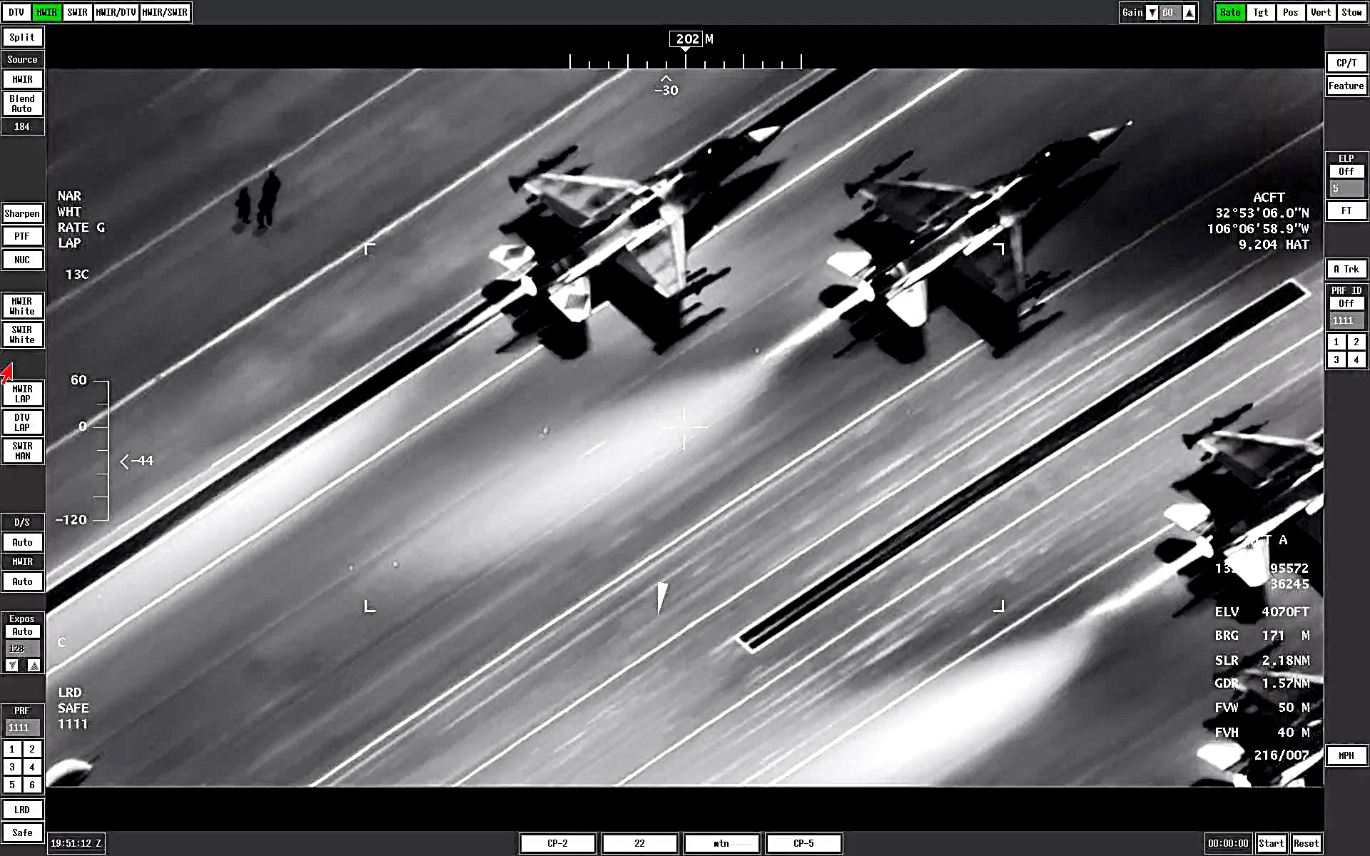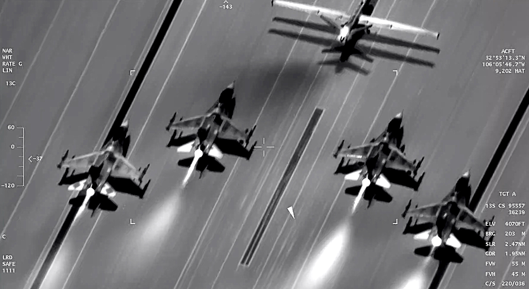 The TV and infrared footage provided by the sensors aboard an MQ-9 give a very different look at the now-familiar elephant walk. As the jets and drones gather on the runway, the thermal signatures from their engines show up as distinct white plumes on the infrared camera.