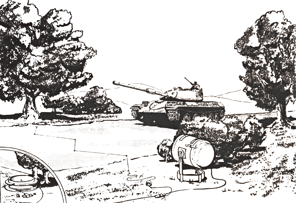 An open sight atop the rear element allows the DM22 to be aimed and positioned, and among the limited amount of data available about the system, it is shown to be deployed at a 90-degree, perpendicular angle to the target’s assumed path of movement. Once it’s tripped, the rocket fires into the side of the tank, detonating the HEAT warhead. The fiber optic cable can then be replaced with a more complex infrared sensor to extend the DM22’s triggering range.