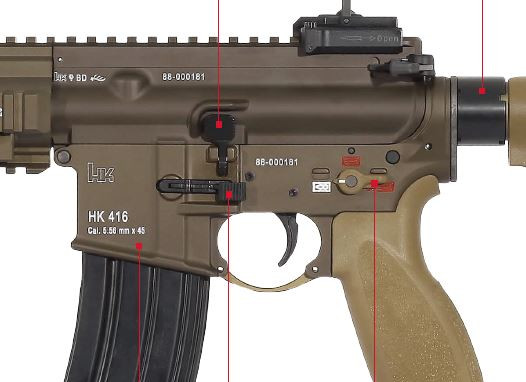 The HK416 series is derived from the U.S.-designed AR-15/M16 pattern, but differs substantially from that parent design in its use of a physical gas piston rather than so-called direct impingement to cycle the action. Direct impingement uses propellant gas siphoned off from the barrel during firing and dumps it directly into the internal action of the gun. A gas piston system offers advantages when it comes to reliability since it does not blow that gas, and the particulate matter it generally carries, directly into the main action, where it can build up on various surfaces. Instead, it uses propellant gas and cycles the bolt via a mechanical piston system.